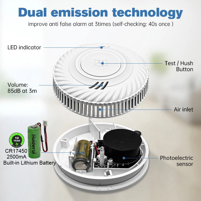 Dual emission technology: Improve anti false alarm at 3 times (self-checking: 40s once).